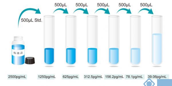 3. 标准品梯度稀释:加入标准品/样本稀释液(SR1)1ml至冻干标准品中,静置15分钟待其完全溶解后轻 轻混匀(浓度为2500pg/ml),然后在其余七管中各加入500L标准品/样本稀释液(SR1),按照以下浓度 进行2倍稀释:2500、1250、625、312.5、156.25、78.12、39.06、0 pg/ml进行稀释。2500pg/ml标准曲线 最高点浓度,标准品/样本稀释液(SR1)作为标准曲线的零点(0pg/ml)。复溶过的标准品原液(2500pg/ml) 未用完的应废弃或根据需要按照一次用量分装,并将其贮存在-20~-80℃冰箱,具体如下图。
