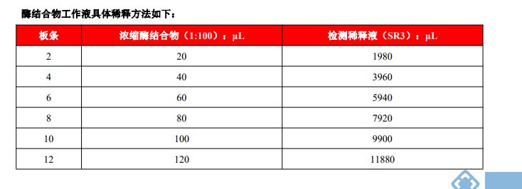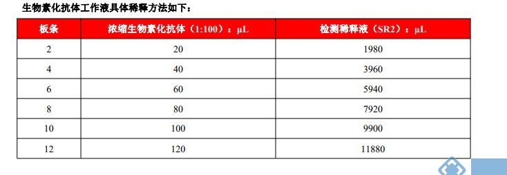 4. 生物素化抗体工作液:预先计算好试验所需用量,用检测稀释液(SR2)将100倍抗体浓缩液稀释成1倍 应用工作液(稀释前充分混匀),请在30分钟内加入到反应孔中。