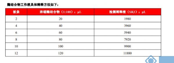 5. 酶结合物工作液:按每次试验所需用量配制,用酶结合物稀释液(SR3)将100倍浓缩酶结合物稀释成1 倍应用工作液(稀释前离心),请在30分钟内使用。