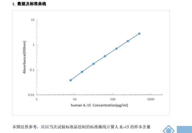 3.以标准品浓度为横坐标,吸光度OD值为纵坐标,用软件绘制标准曲线,样品中IL-15含量可通过对应OD 值由标准曲线换算出相应的浓度。