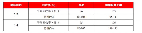 在选取的健康人血浆、细胞培养上清中加入 3 个不同浓度水平的人 IL-15,计算回收率。