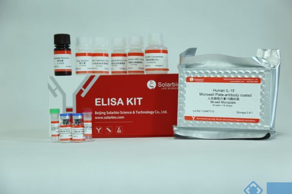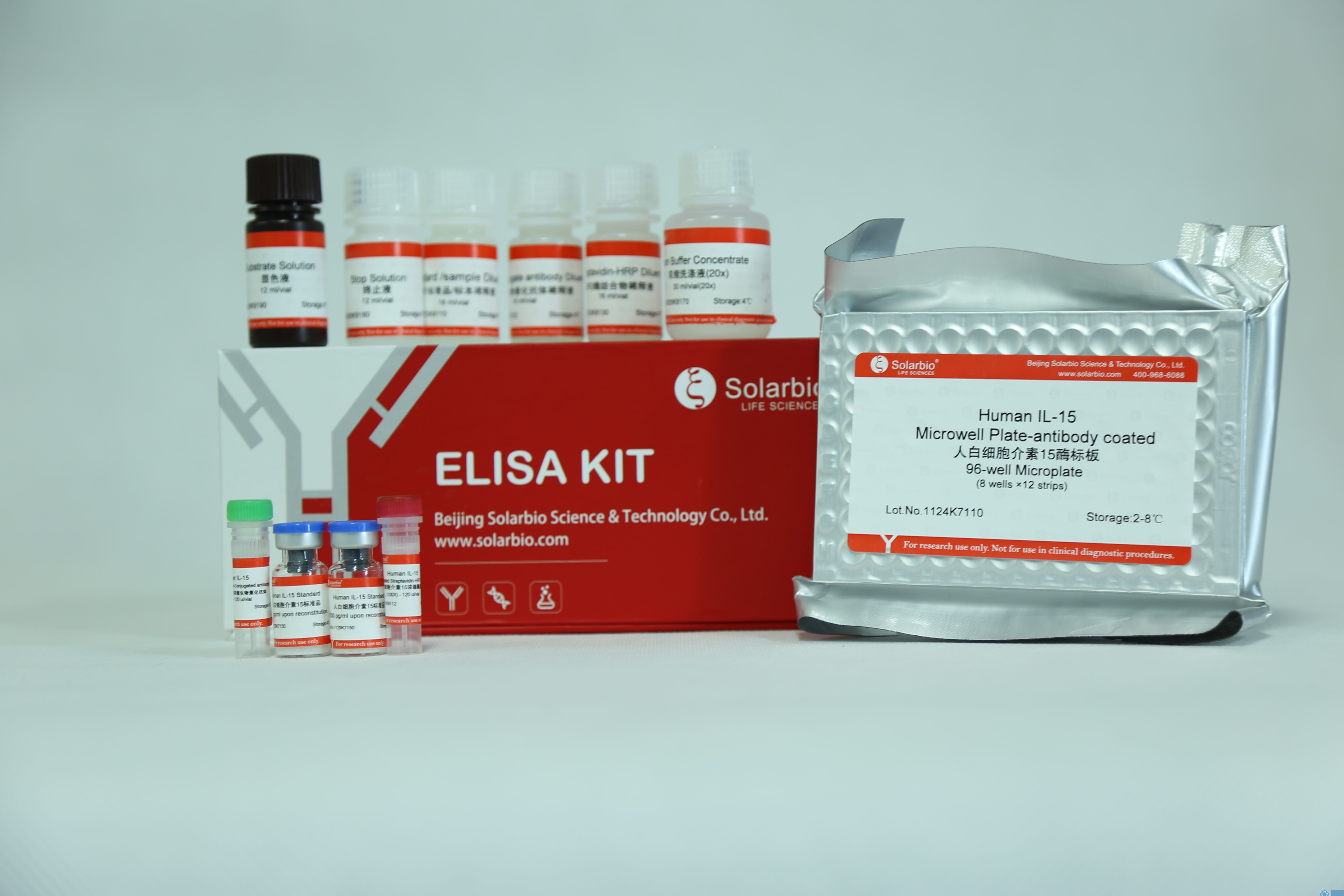 Solarbio (Solarbio ®) ELISA 试剂盒采用基于双抗体夹心法的酶联免疫吸附检测技术。将抗人 IL-15 单克 隆抗体包被在酶标板上;分别加入梯度稀释的标准品和预稀释的样本,标准品和样本中的人 IL-15 会与酶标 板上的包被抗体充分结合;洗板后加入生物素化抗人 IL-15 抗体,该抗体会与板子上包被抗体捕获的标准品 和样本中的人 IL-15 发生特异性结合;洗板后加入辣根过氧化物酶(HRP)标记的链霉亲和素,生物素与链 霉亲和素会发生高强度的非共价结合;洗板后加入显色剂底物 TMB,若反应孔中样品存在不同浓度的人 IL-15,则 HRP 会使无色 TMB 变成不同深浅(正相关)的蓝色物质,加入终止液后反应孔会变成黄色;最 后,在λmax=450 nm(OD=450 nm)处测定反应孔样品吸光度(OD),样本中的人 IL-15 浓度与 OD 成正比, 通过绘制标准曲线和四参数拟合软件便可计算出样本中人 IL-15 的浓度。