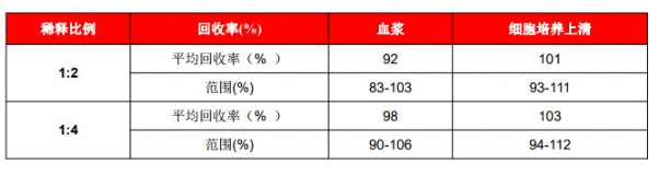 在选取的健康人血浆、细胞培养上清中加入 3 个不同浓度水平的人 FGF basic,计算回收率。